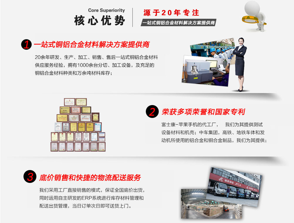深圳市錦發銅鋁有限公司成立于1998年,注冊資金1億元人民幣,是一家國家高新技術企業,榮獲廣東省著名商標稱號??偛考吧a基地位于深圳寶安松崗,占地面積3萬多平方。公司成立以來,一直專注于鋁材、銅材等合金材料的研發、生產加工及銷售。倉儲上萬噸銅鋁合金材料,迅速響應客戶需求。